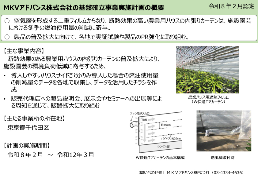 2026年2月10日 / 最終更新日 : 2026年2月10日 m-chemical-agri 商品 農林水産省の推進する「みどりの食料システム戦略」に「W快適エアーカーテン™」が認定 「このたび、農林水産省の推進する「みどりの食料システム戦略」に基づく基盤確立事業実施計画に、弊社の機能性農PO内張りフィルム「W快適エアーカーテン™」が認定されました」 基盤確立事業実施計画の認定状況及びみどり投資促進税制の対象機械について:農林水産省